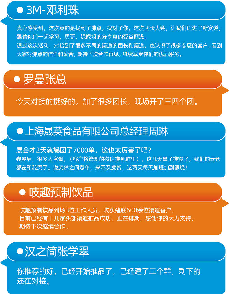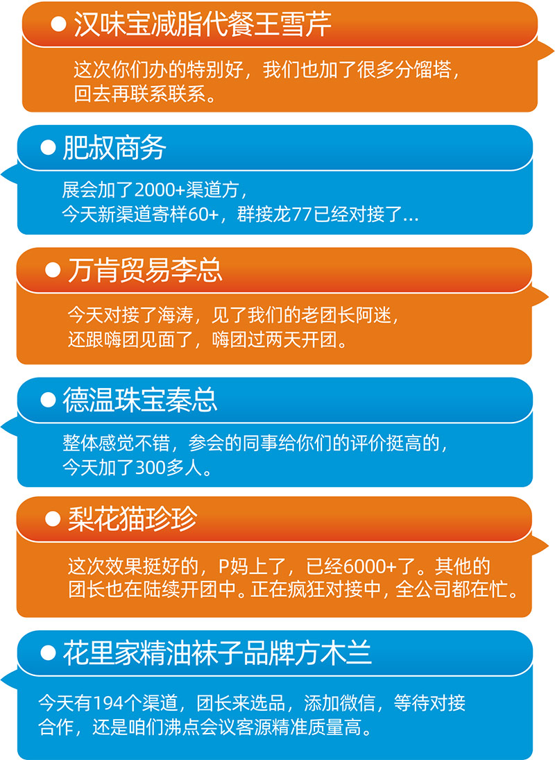 供貨商反饋之前鏈接不到的團長,這次都找到了,并且推了品;還有供貨商反饋,就在推品鑒賞會當場與團長談定了首發的合作;也有不少供貨商報喜說是跟團長談成了上架的合作;總之,面對面向渠道方推品鑒賞會,面對面選品,就是這么高效!