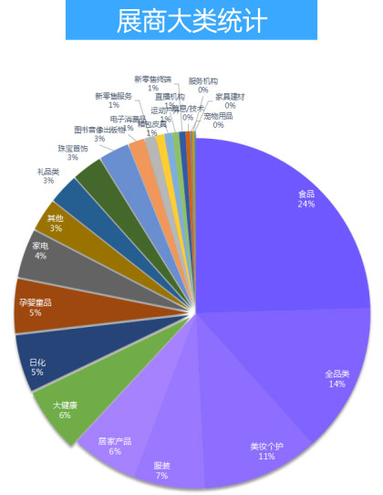 本次參展的產品品類中,食品,全品類,美妝個護,居家,服裝,大健康,與上屆相同,依然是前六位。