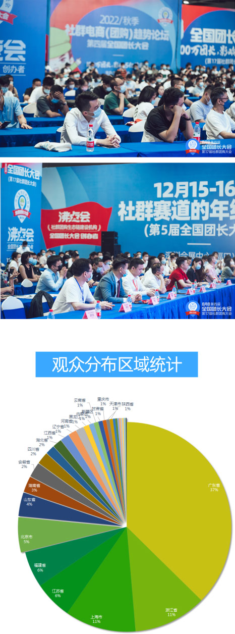 而本屆觀眾來源最多的5個城市是:廣東省,浙江省,上海市,江蘇省,福建省;上半年,上海的新增團長數量巨大,而貨源又是團長的咽喉,所以,眾多上海團長來參加團長大會,來篩選產品,是理所當然的事情;于是,本次團長大會,從上海來的觀眾數量占觀眾總數的11%。