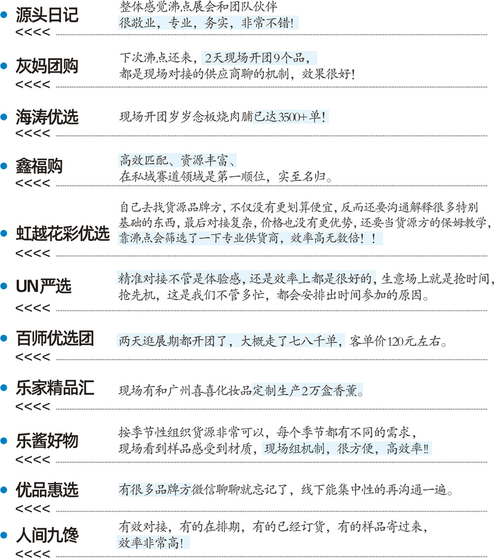 產品精準,展商專業,對接十分高效。很多展商都是通過沸點會展前培訓的,很多都提前做好了筆記,準備好了價格表,來了就可以直接開團合作。