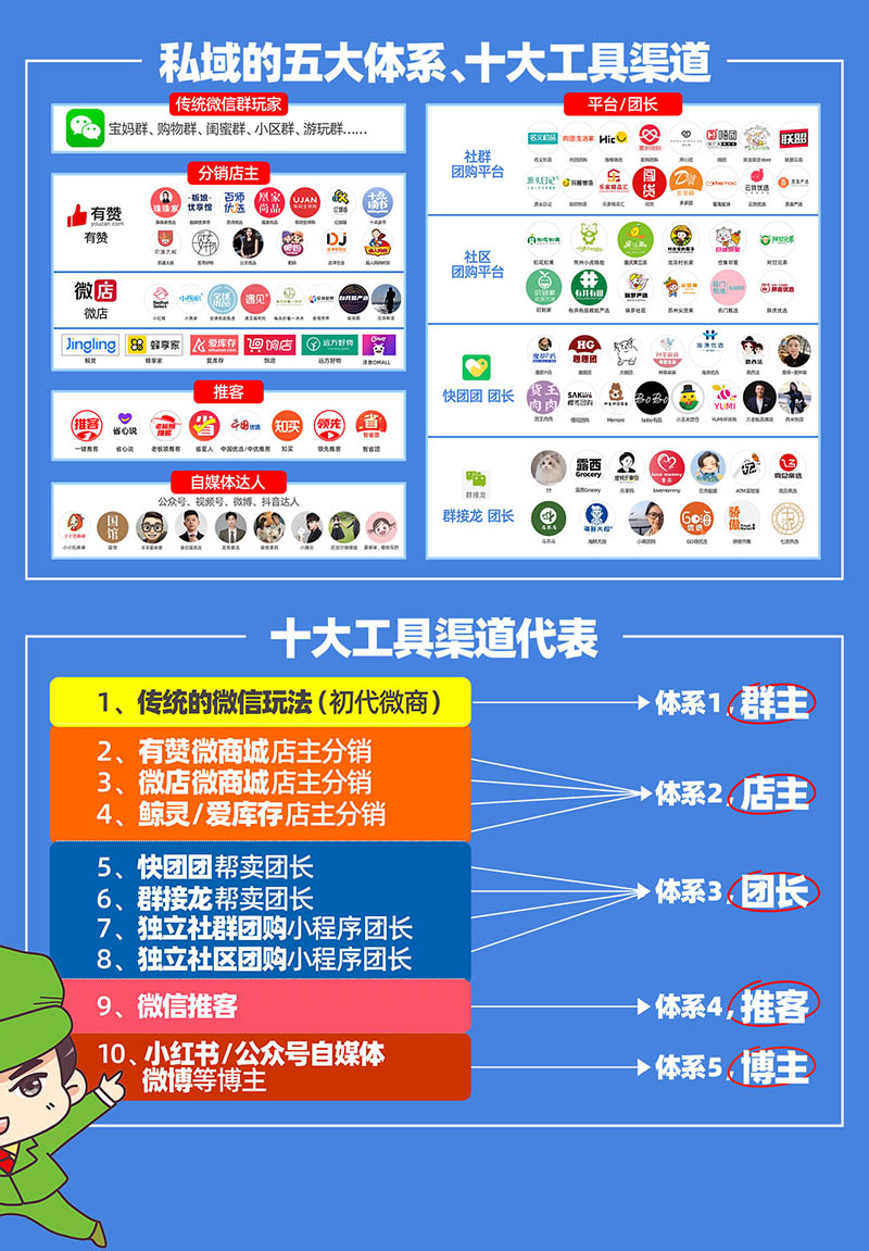 十大渠道全覆蓋:私域5大體系+全域渠道資源(社群、團長、推客、直播、跨界聯盟…)