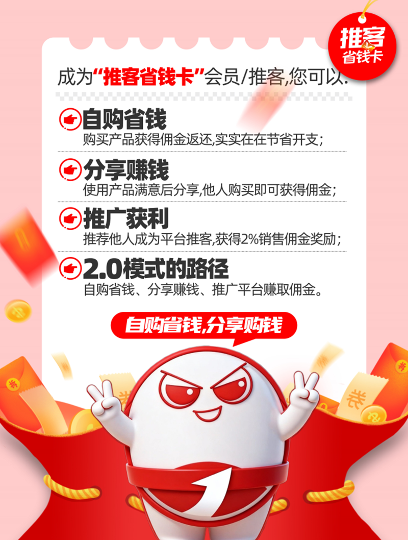 傳統(tǒng)的推客模式往往依賴于推廣者的社交關(guān)系鏈進(jìn)行單向信息轟炸,而忽略了消費(fèi)行為本身的價值。推客省錢卡2.0模式對此進(jìn)行了根本性重構(gòu)。它借鑒并升級了“自購省錢”的成功玩法,將商業(yè)邏輯的起點(diǎn)牢牢錨定在“用戶體驗(yàn)”之上。