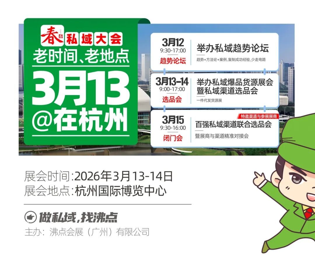 第30屆沸點會(杭州)直播+社群團購貨源供應鏈展覽會將于2026年3月13-14日在杭州國際博覽中心舉行:50,000㎡展會規模、1000+優質供應商、98%以上私域頭部渠道齊聚,一站式對接直播、社群團購、私域平臺的全年貨源。